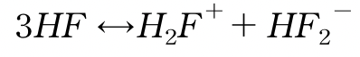 이 반응이 일어나게 되면 특이한 음이온인 HF2-가 하나 생기게 된다. 이때 이 음이온이 다른 플루오린화 수소 분자와 반응하여 생성물을 제거해버린다. 그러면 르 샤틀리에 원리에 의하여 위 반응이 거의 오른쪽으로 치우치게 된다. 이때 H2F+ 이온을 잠깐 생각해보면 H3O+이온과 마찬가지로 산성을 나타내는 양성자라는 것을 알 수 있다.이는 용액이 매우 강한 산성이 된다는 뜻이다. 실제로 무수 플루오린화 수소 용액은 pH 함수가 아닌 Hammett Acidity Function을 통해 산도를 계산하고, H0 =-11정도 된다는 것을 알 수 있다.