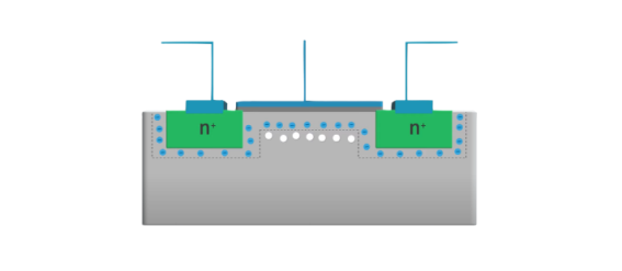 + 전압을 걸어주게 되면 양공이 전극으로부터 멀어지고 전자들은 전극 쪽으로 모여 든다. 이를 위해 저농도 도핑이 필요하며 이 떄문에 위 그림 같이 전류가 흐를 수 있는 통로가 생기게 되는 것이다.