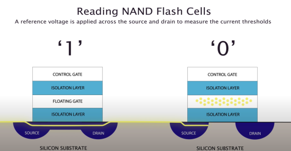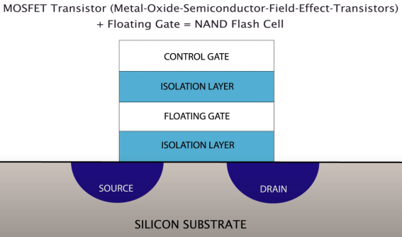 NAND Flash Cell은 MOSFET 위에 플로팅 게이트를 얹어 전압이 걸려있지 않아도 채널이 열린 상태 혹은 닫힌 상태를 유지할 있도록 한다.