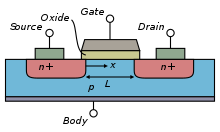 금속 산화막 반도체 전계효과 트랜지스터 (MOSFET)는 모스 축전기에 의한 전하농도의 변화에 기초를 두고 있다. 두개의 단자(소스와 드레인)는 각각 분리되어 고농도로 도핑된 영역에 연결되어 있다. 이런 영역은 P형이나 N형이 될 수 있지만 두개는 반드시 동일한 형태이어야 한다. 고농도 도핑 영역은 일반적으로 도핑 형태에 따라서 '+'로 표시된다. 이 두 영역은 이와 반대 형으로 도핑된, body라는 영역에 의하여 분리되어있다. 이 영역은 고농도 도핑이 아니며 '+' 기호가 없다. 활성 영역은 모스 축전기를 구성하며 세 번째 전극, 즉 게이트가 되어 몸체 위에 있으며 산화층에 의해 다른 모든영역과 절연되어 있다.