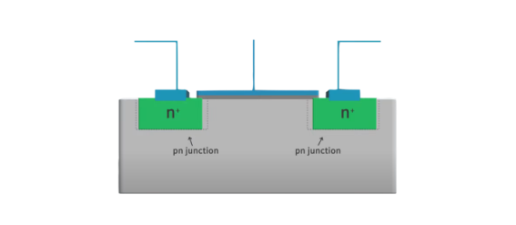 p형 반도체와 n형 반도체가 접합한 결과 위 그림과 같이 pn junction (공핍층)이 p형 반도체와 n형 반도체 사이에 생기게 된다. 이는 소스와 드레인 사이를 p형 반도체와 공핍층이 격리 시킨다. 그리고 이때의 상태를 0이라고 한다.